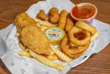 Chicken tenders, fried cheese, garlic mushrooms, onion rings and fries, served with honey mustard or BBQ sauce.
